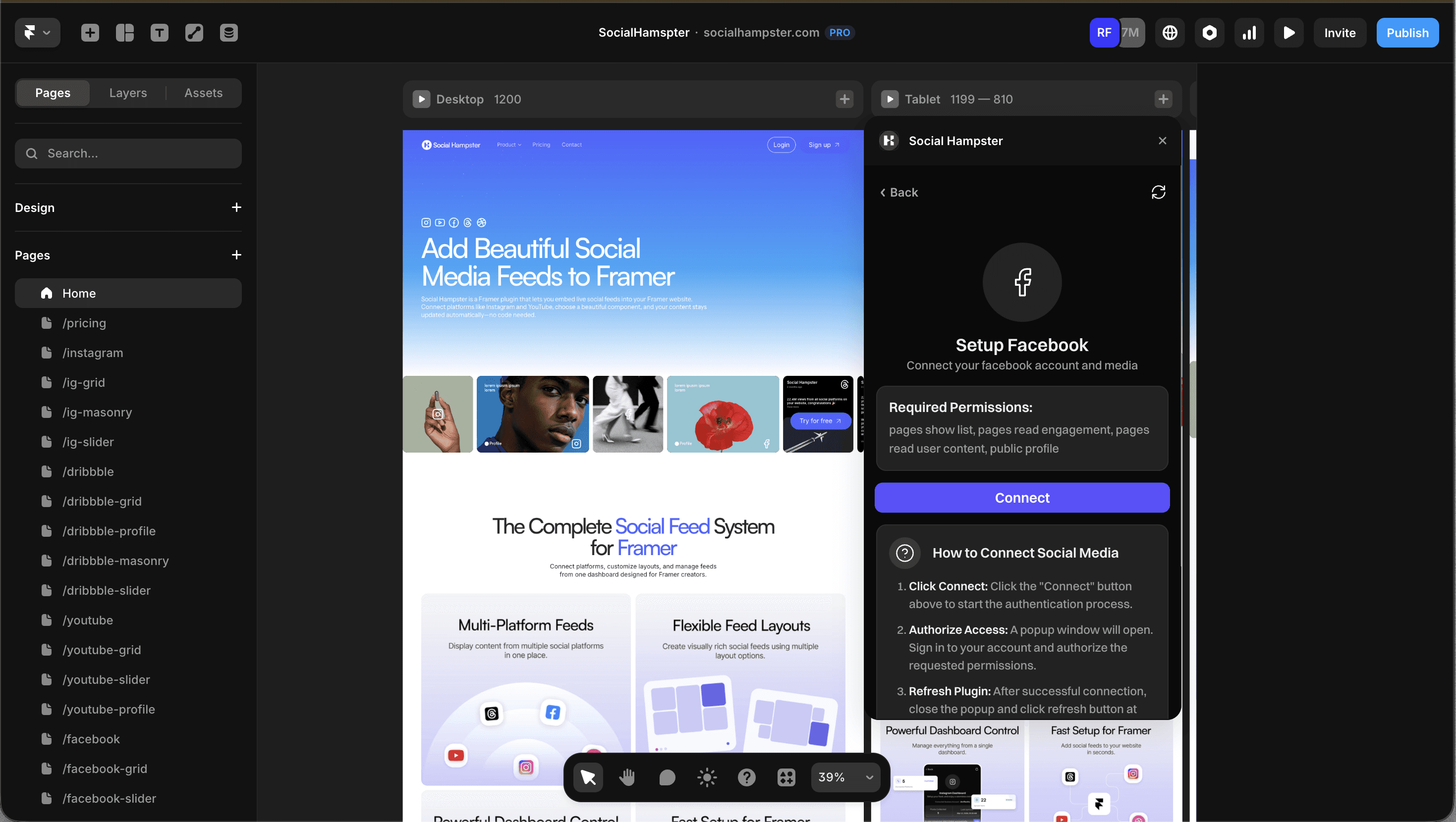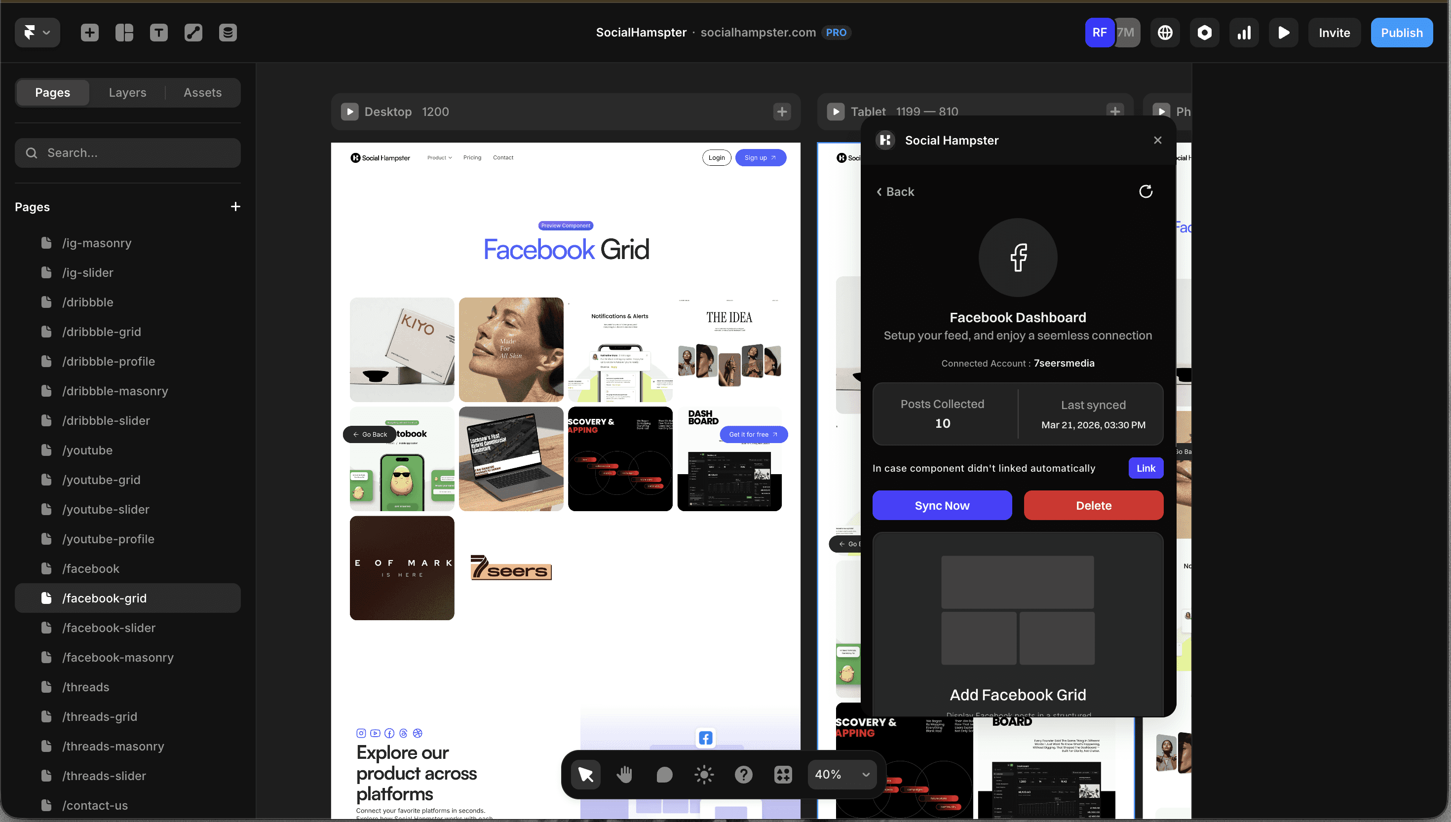 Social Hampster bypasses all of this. Instead of embedding Facebook's UI, it fetches your posts via the Facebook Graph API and renders them using native Framer components lightweight, styled to your design system, and responsive at every breakpoint.