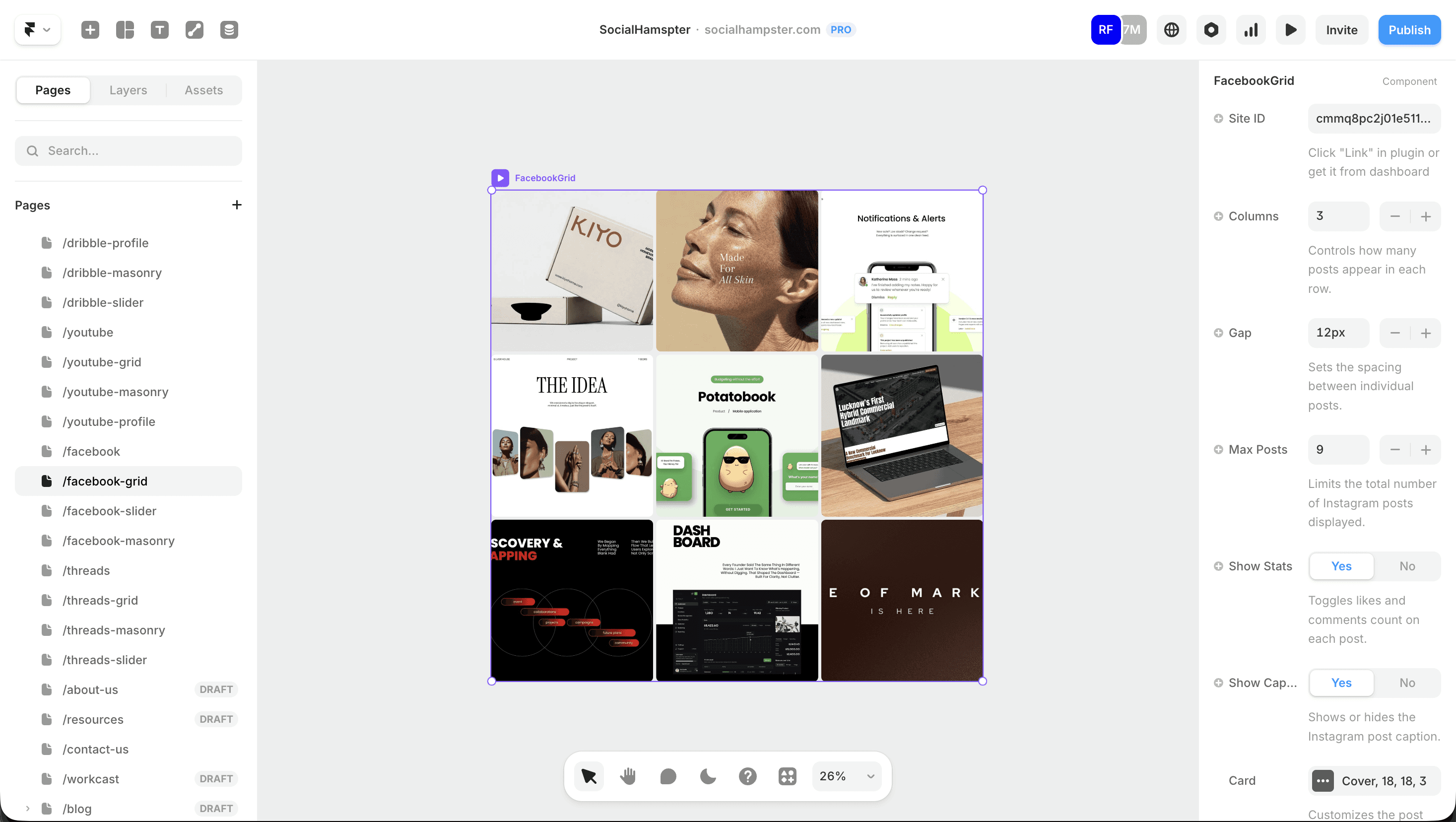 Social Hampster fixes that. It's a Framer-native plugin that embeds a live Facebook Page feed as a real Framer component Grid, Masonry, or Slider with zero iFrames and up to 3,000 views/mo on the free plan (unlimited on paid plans).