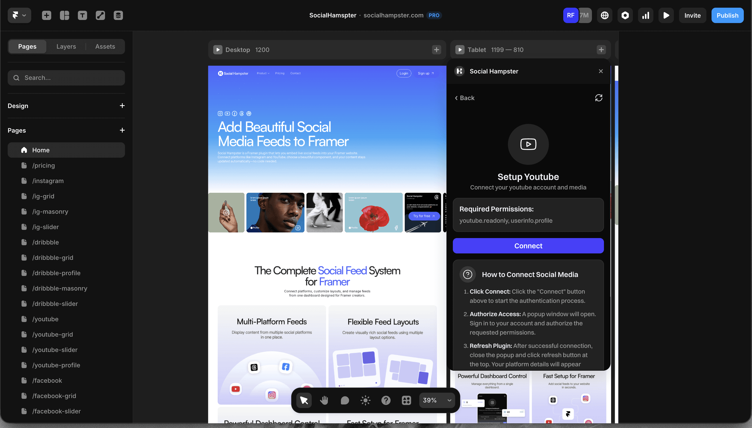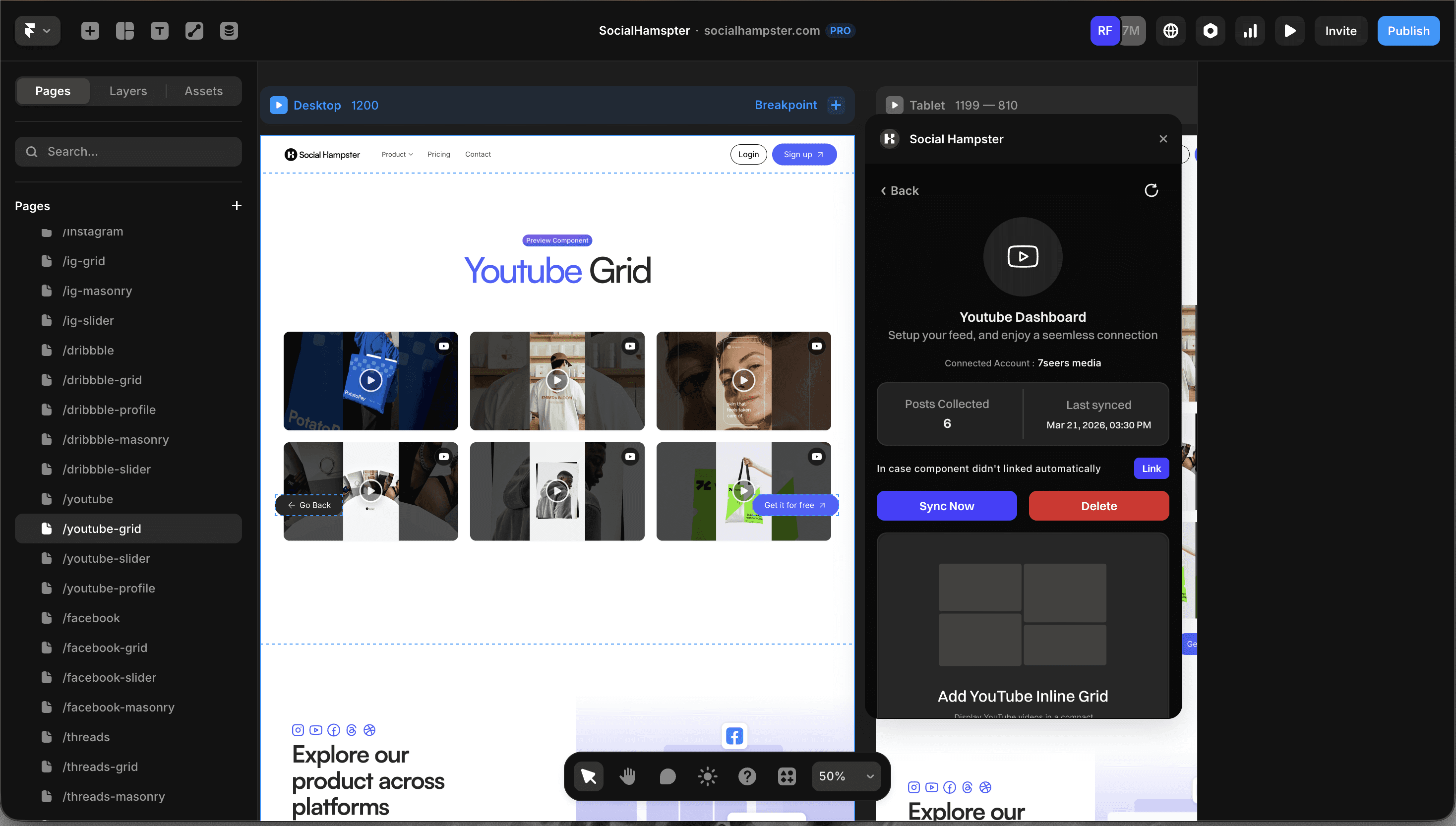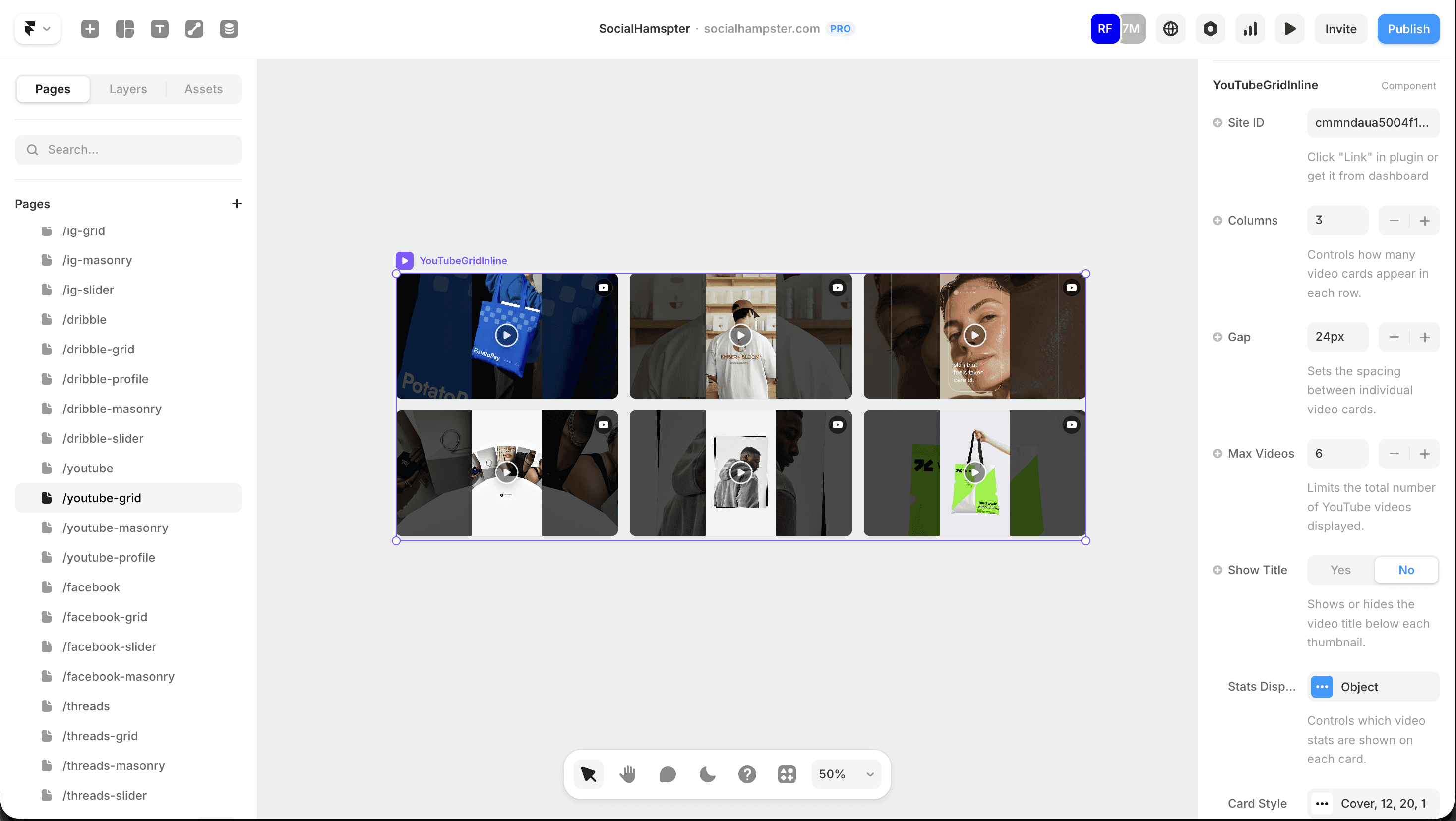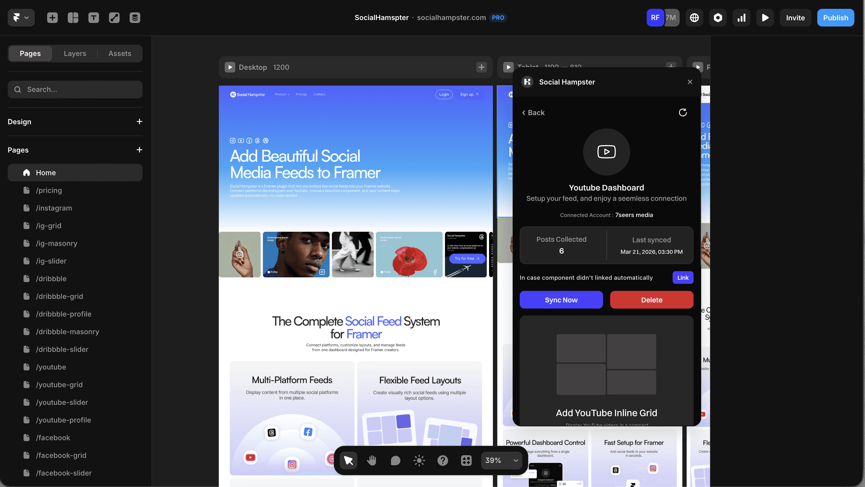 Social Hampster's YouTube components are Framer-native. They live in your Layers panel, snap to your grid, scale responsively across breakpoints, and inherit your site's typography exactly like any other Framer component.
